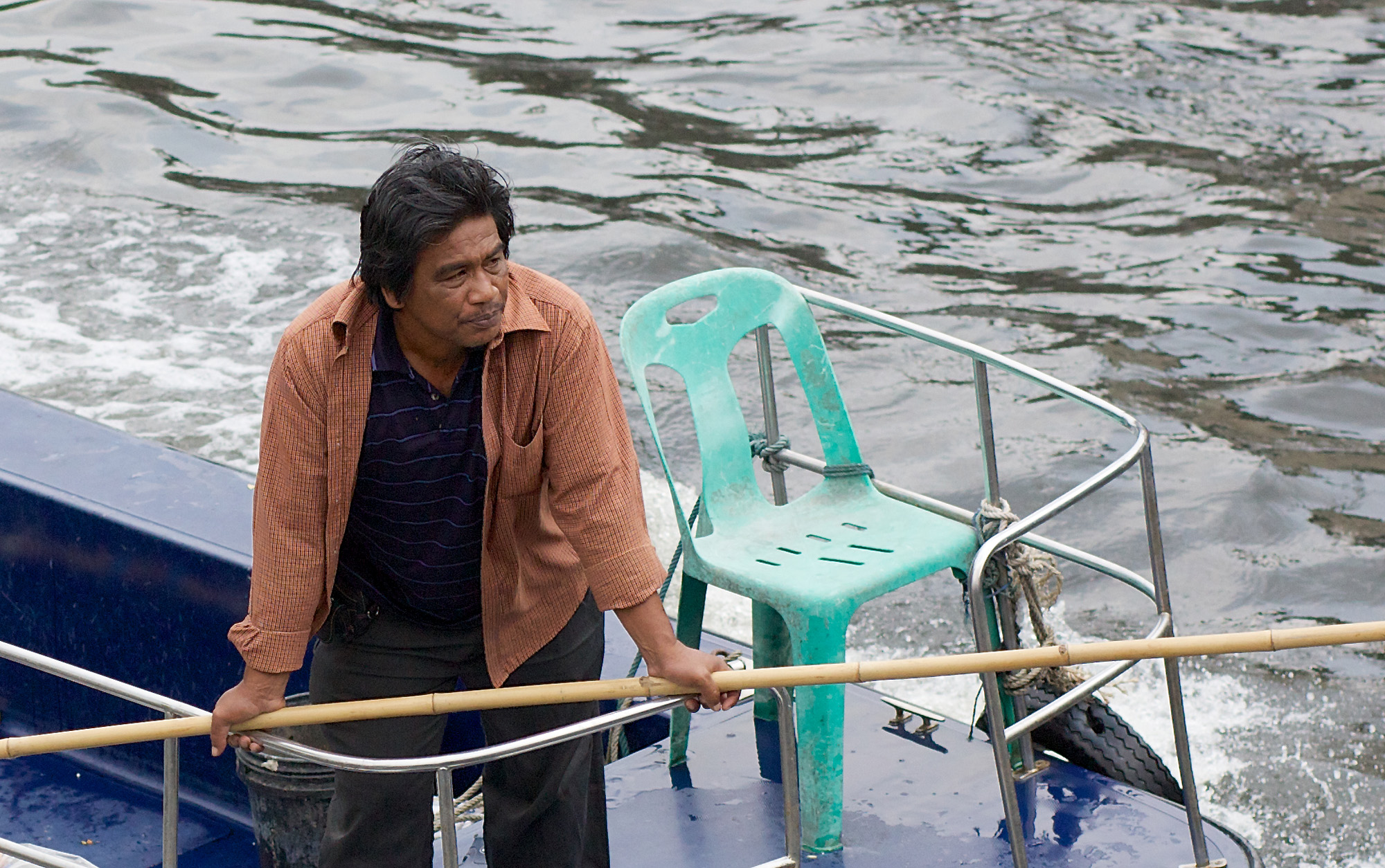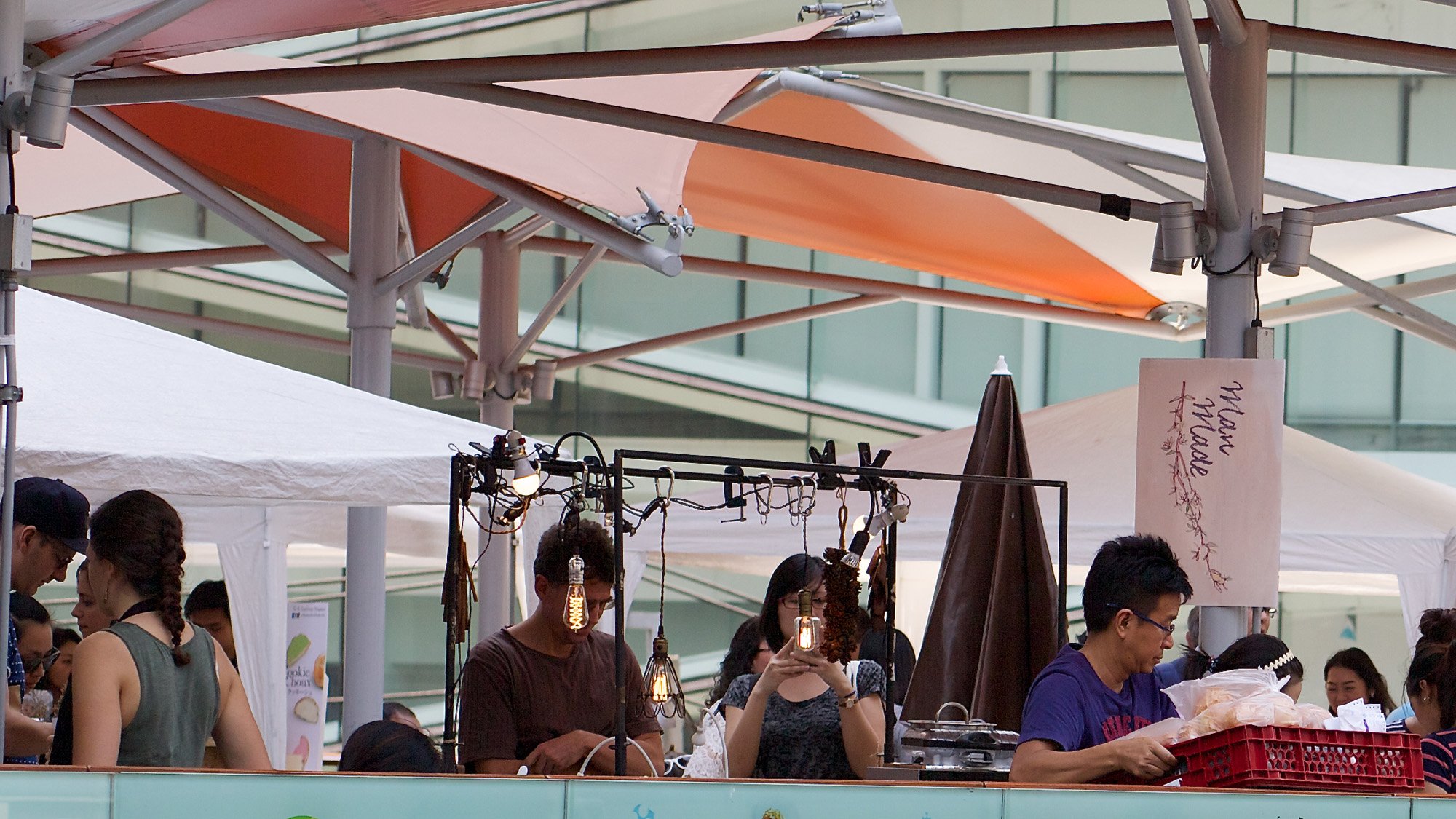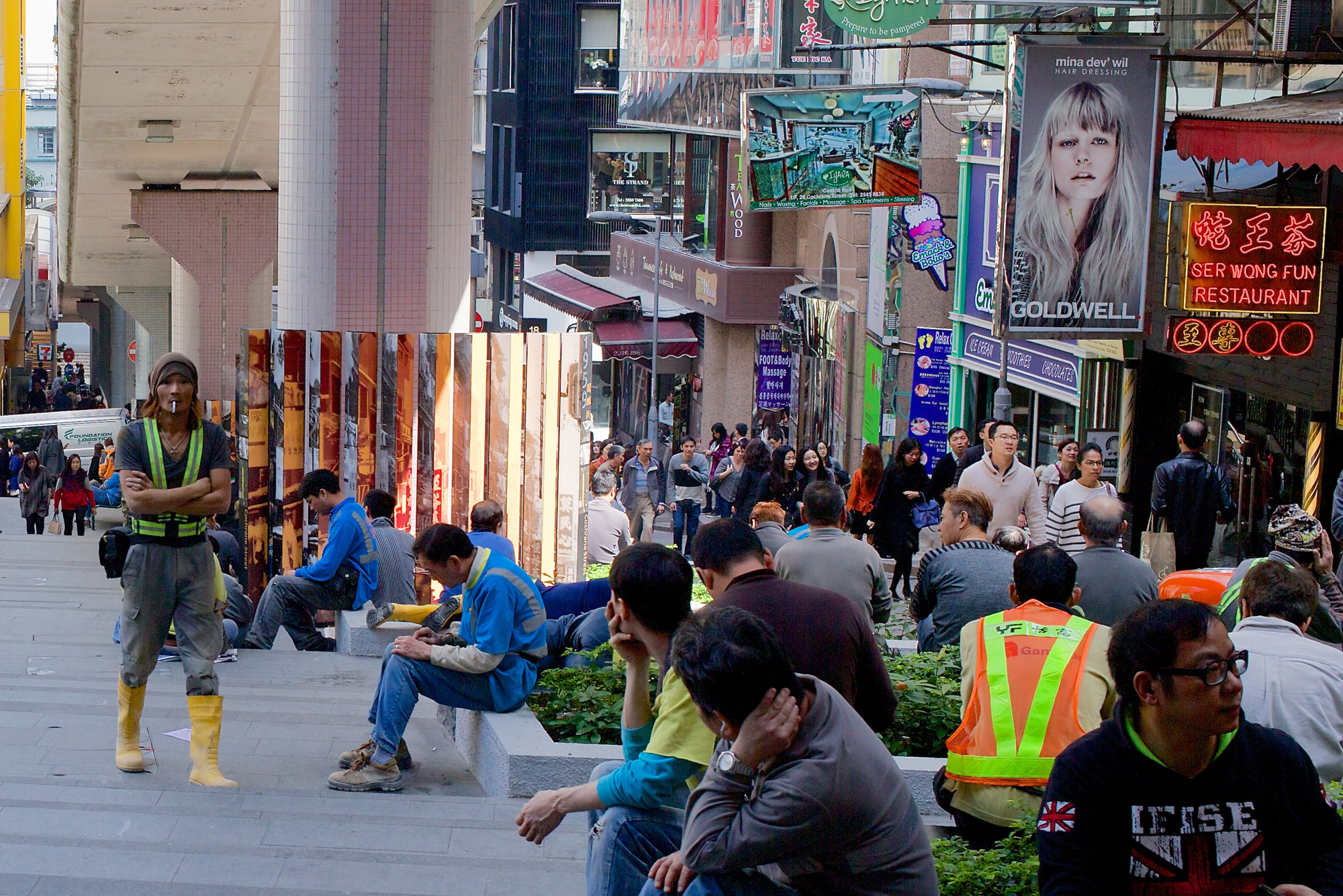 In the skewed image I’ve deliberately downplayed the individuality of the figures by hiding their faces. Yet their physicality is very much in evidence. Just by looking at them in the photo you can feel the action of using a stiff broom on concrete, or clipping the grass with the shears. In this sense, the picture is all about the “Sensation of Living,” as proclaimed by the banners for a nearby condo development (although I doubt if the new occupants will be clipping their own grass).