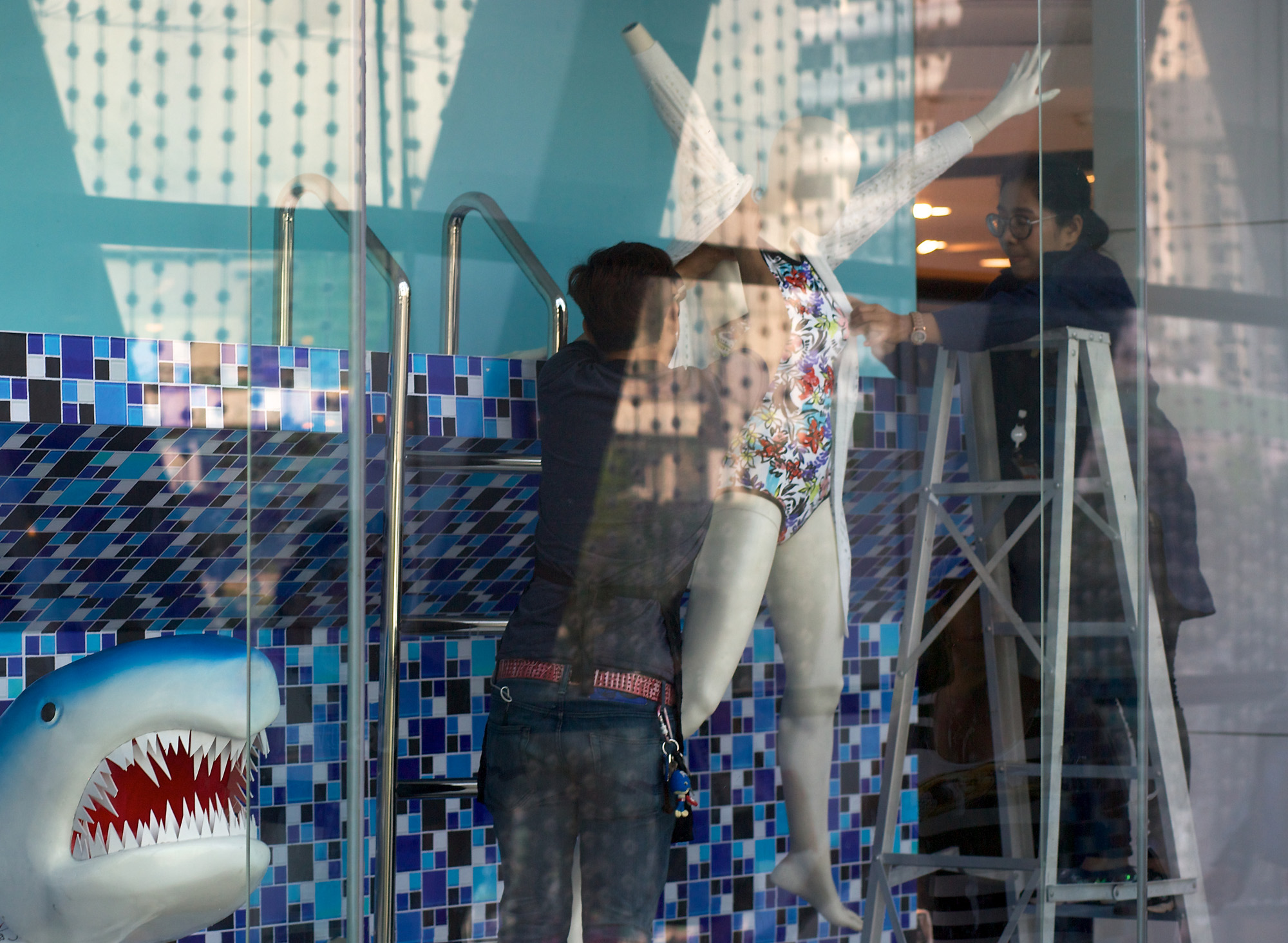 I think I get away with the glaring colour clashes in my image of the sales assistants on their drinks break. The one in “maximum orange” (No.10) is clearly the dominant figure. She’s the only one standing up — and among all of them is wearing the highest heels and seems to be confronting one of the others. The reddish-pink bench points towards her; and my own reflection — thankfully — is not too obvious as I was wearing my favourite blue shirt that day.