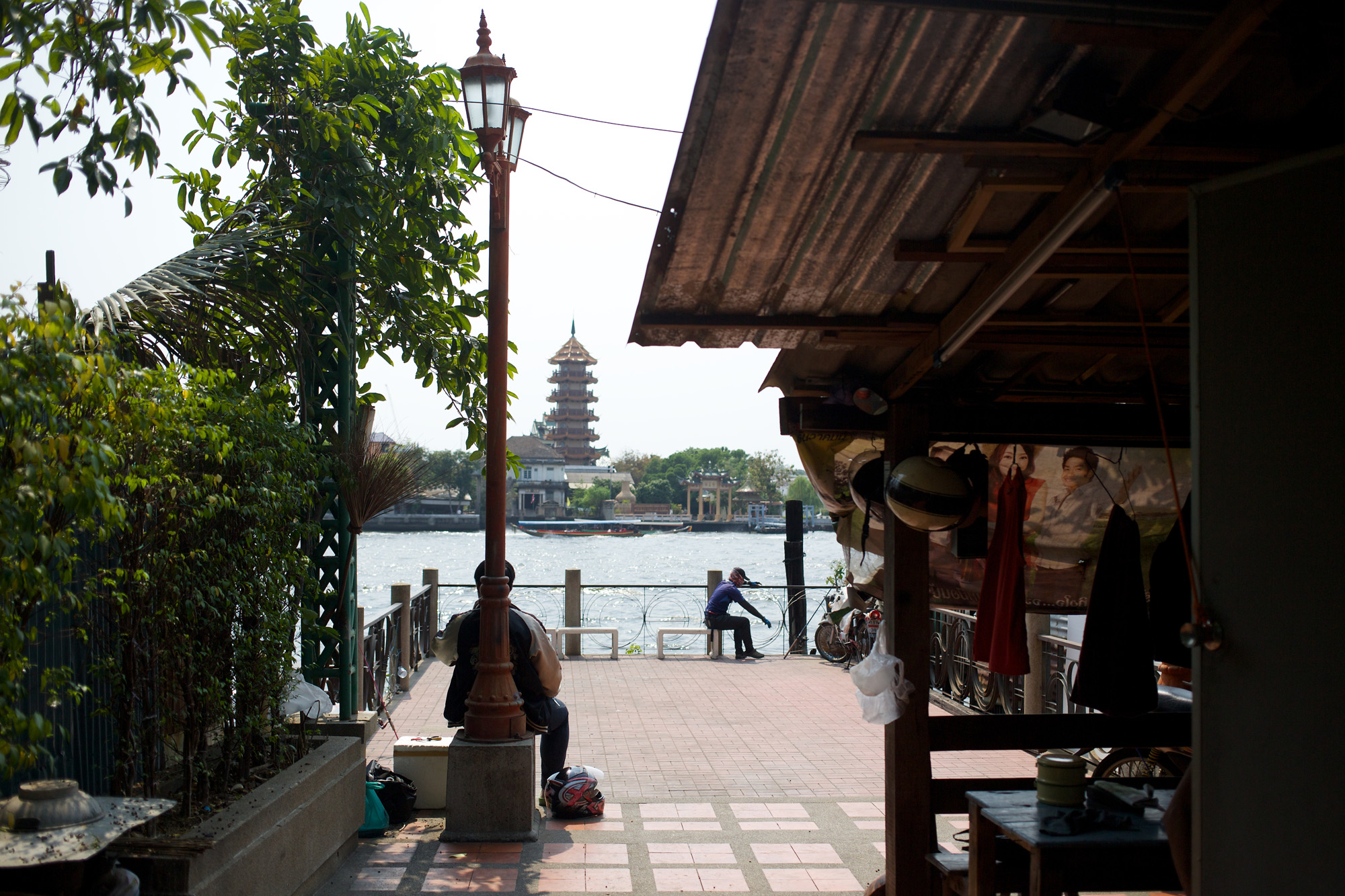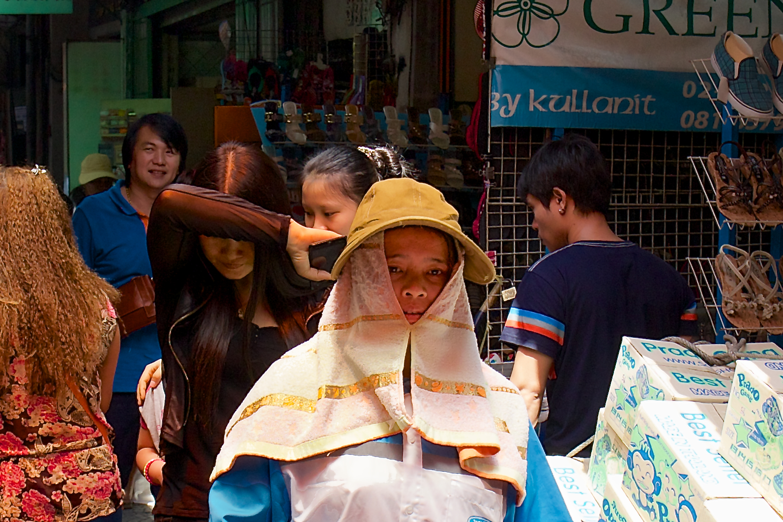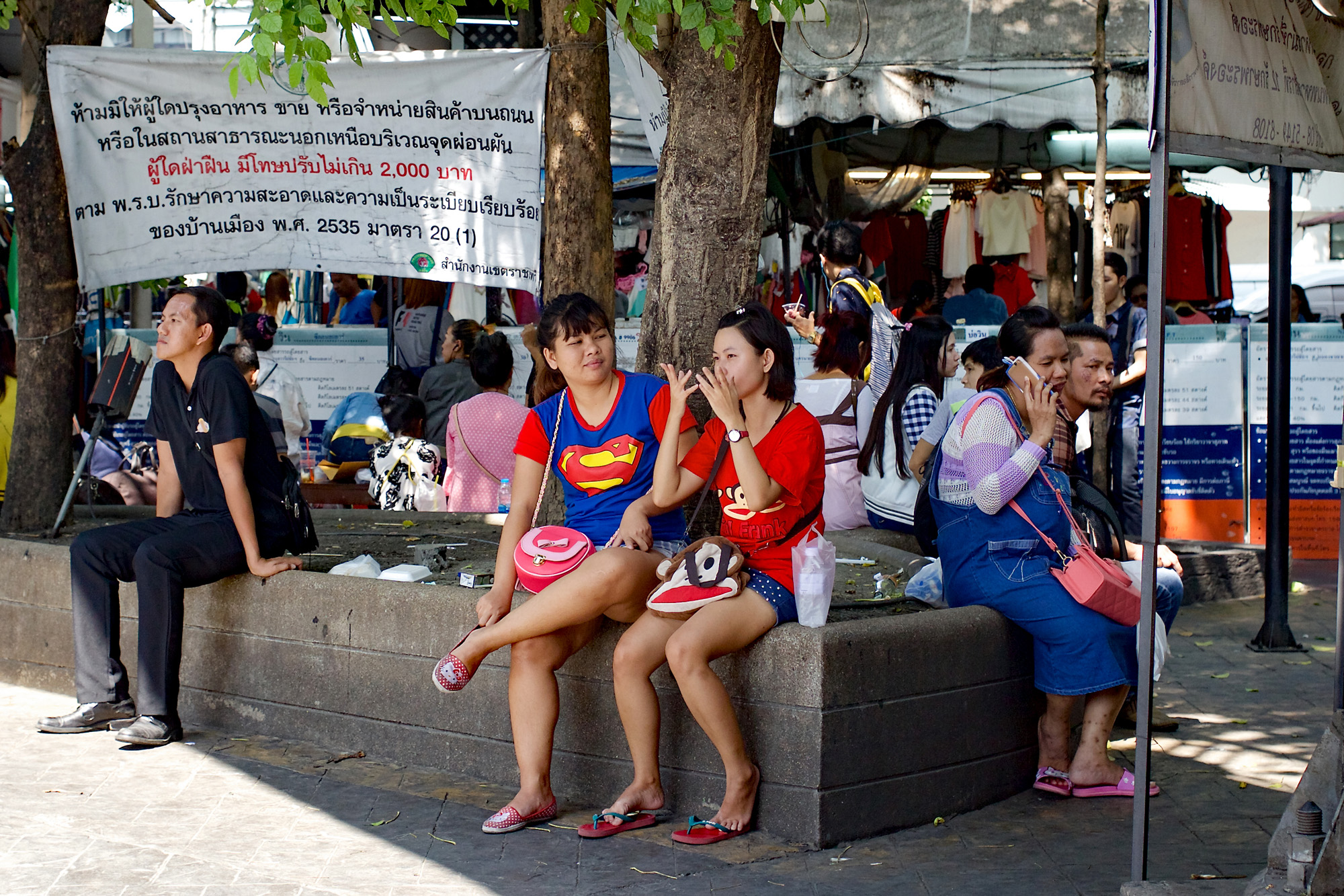 Like people in the workplace, colours vie with each other for dominance. In my next image (below) blue and black vie for dominance, with green hovering in the background, calming them down and bringing them together. Taken from above (at the Thonglor Skytrain station in Bangkok) the image is skewed so the gardeners and the flags can fill the frame completely.
