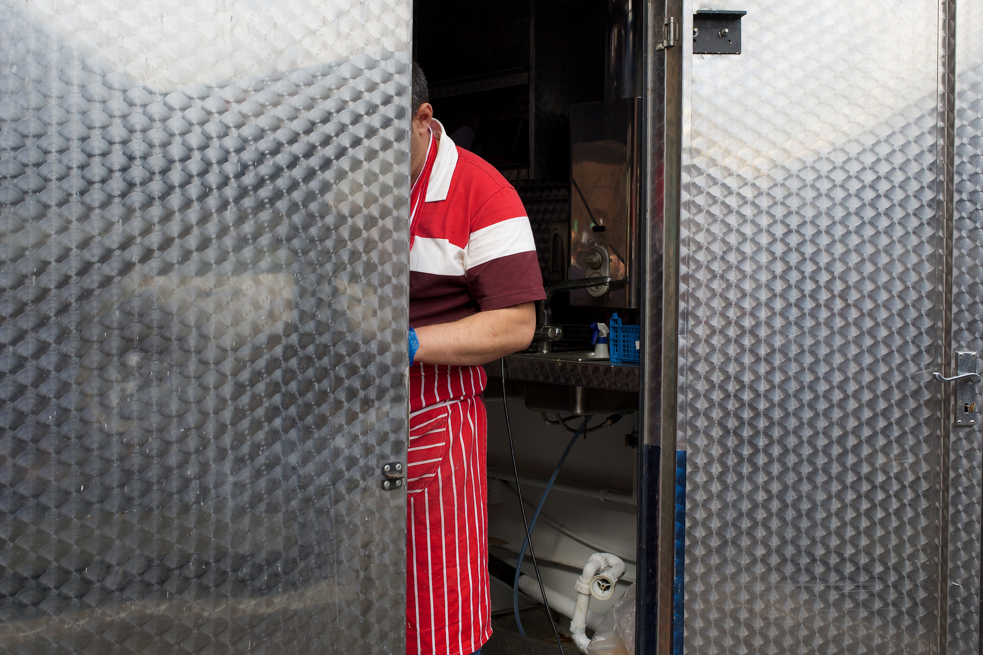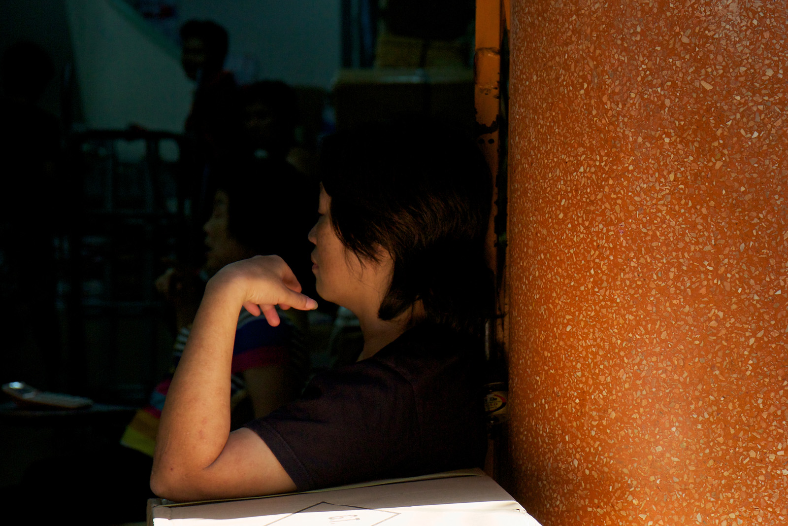 As you can see, the woman is looking off to the left, away from the man. For whatever reason, her expression is a bit grumpy, as though she’s either bored — for lack of customers — or waiting impatiently to be served.