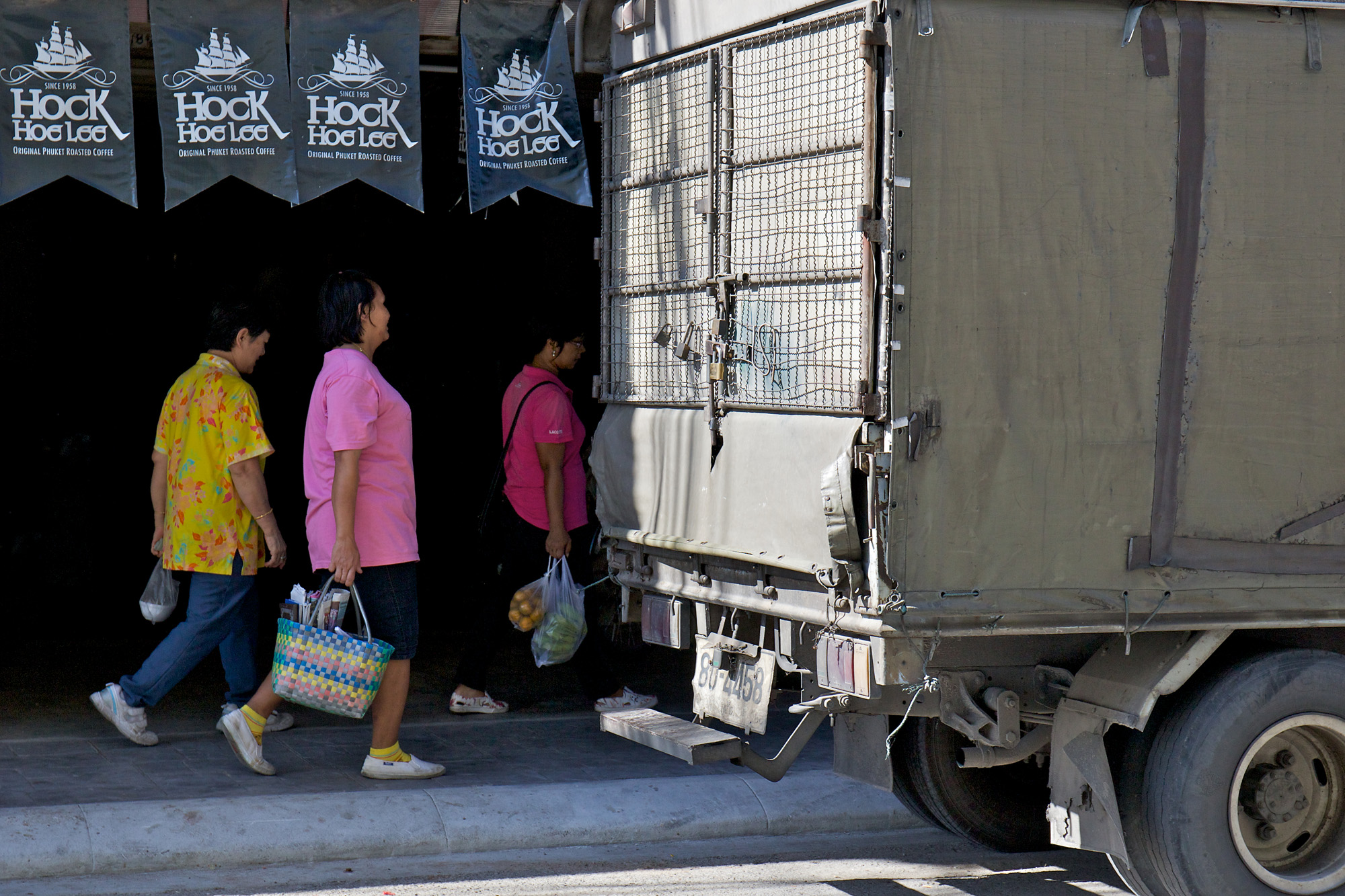 I’m not suggesting that the scarves are in any way responsible, but I’m struck by the difference in appearance between the man and the woman. She’s dressed in neutral colours: black skirt, white shirt, and carries a white shoulder bag. She’s also clearly cross about something and has put the man on the defensive. He in turn wears a turquoise tee-shirt, a jacket with bright orange flashes, and rides a bright red scooter with a red, but not-quite-matching helmet.