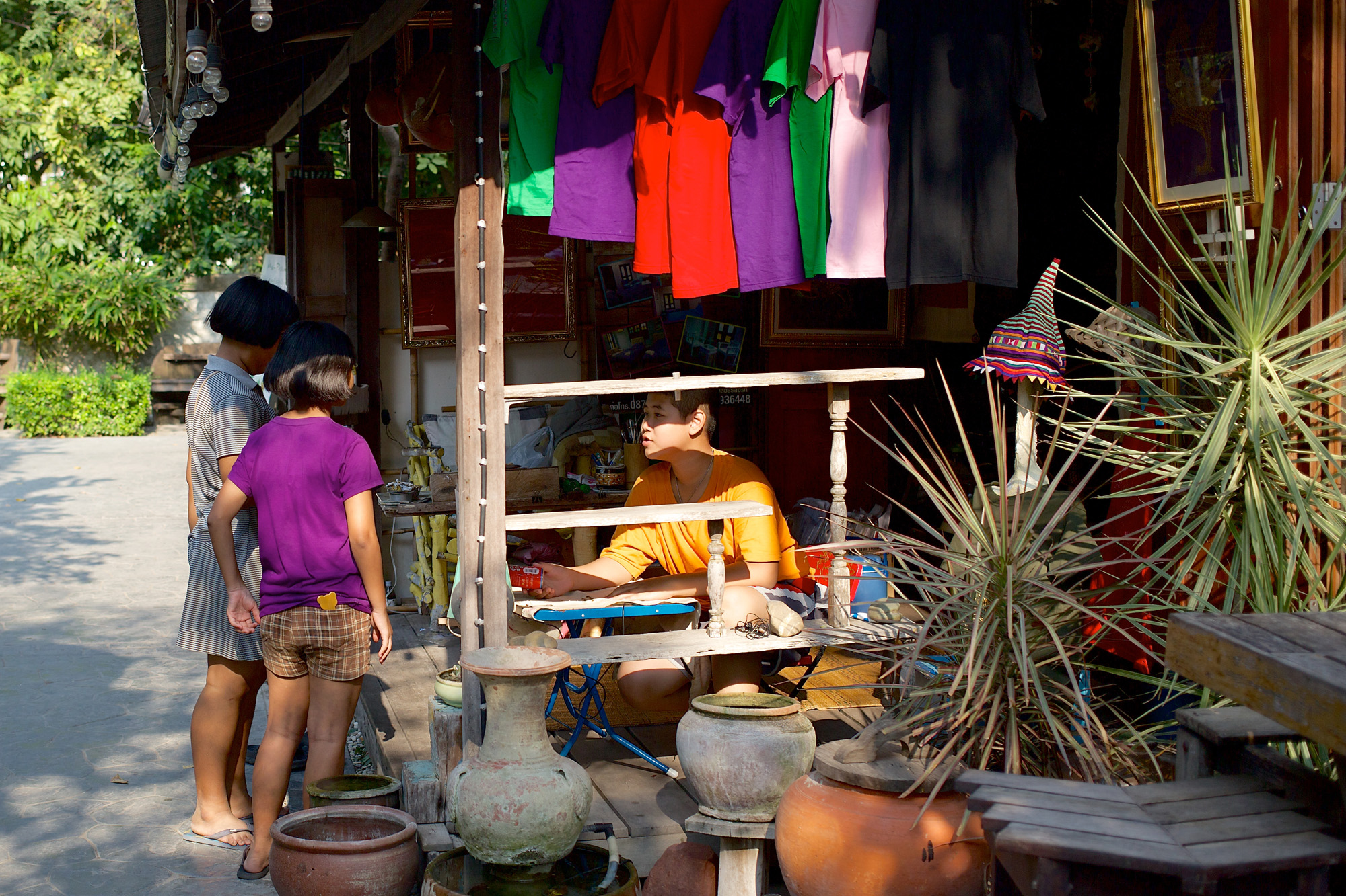 In a sense, this photo is the reverse of the other one. This time the man wears neutral colours whereas the woman is dressed in tasteful pink. The goods on display show a marked preference for warm colours, with pinks and reds predominating.