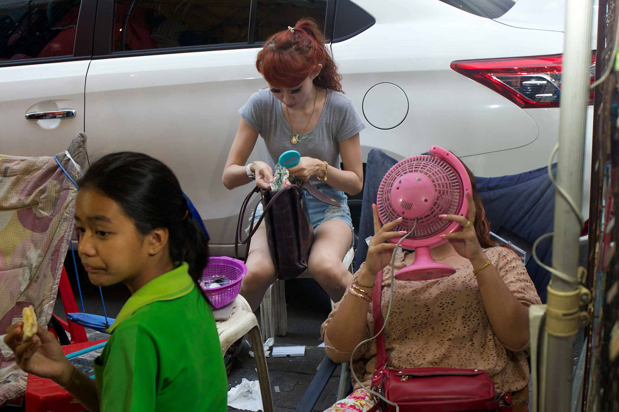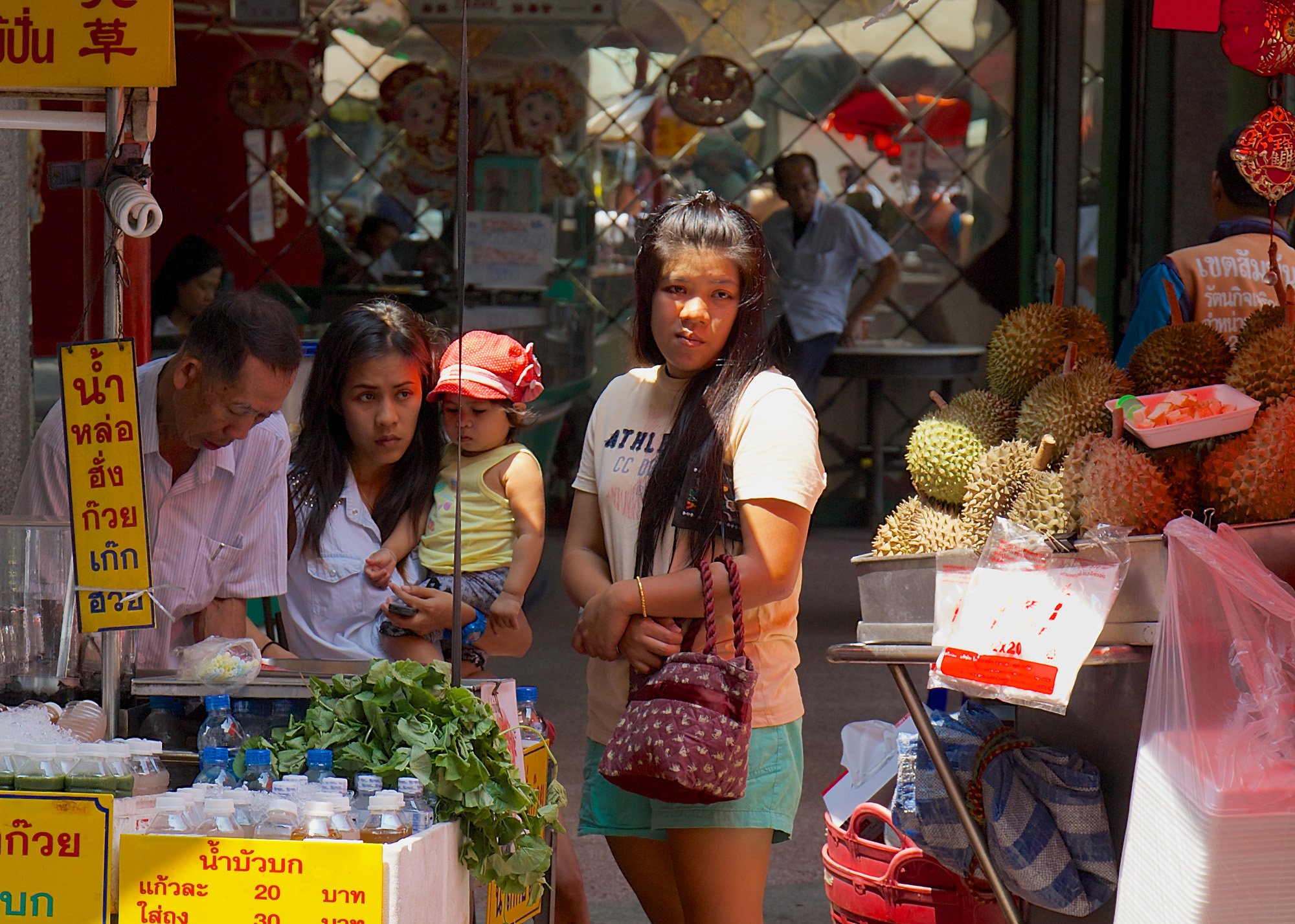 The main figures are surrounded on each side by copious amounts of food and cold drinks, the sight of which is satisfying when we view a street scene taken in brilliant sun. Those durians look delicious, don’t they?