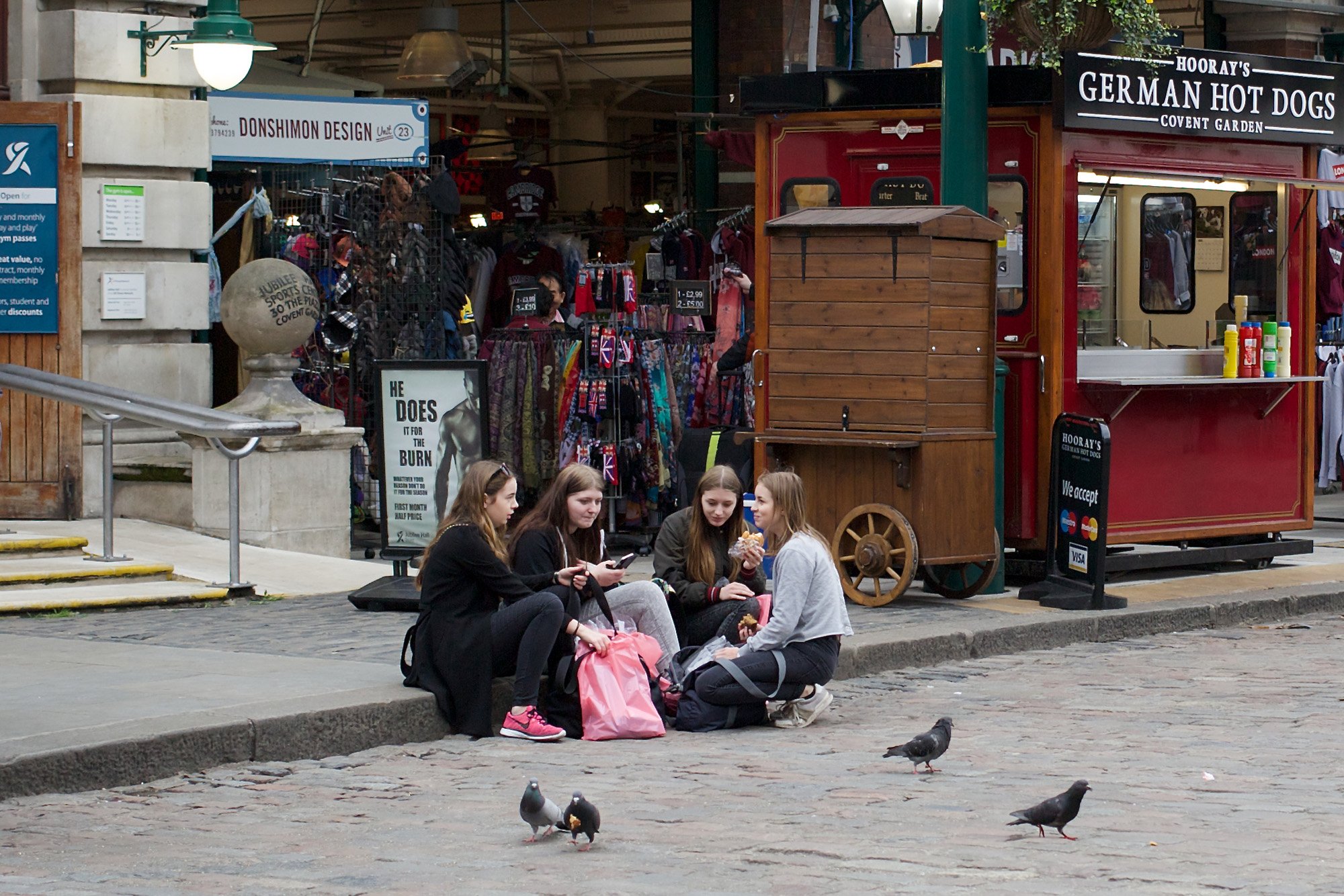 The girls in my featured photo (at the top) have decided to park themselves on the kerbside in Covent Garden’s famous square. I like this shot because the subjects look like they’re having fun. They may not be comfortably seated or having a “fine dining” experience, but at least they’re getting in touch with nature. I’ve called the picture “4 Girls, 4 Pigeons,” in recognition of the similarity between the two groups. One pigeon has scored a complete takeaway meal of his own.