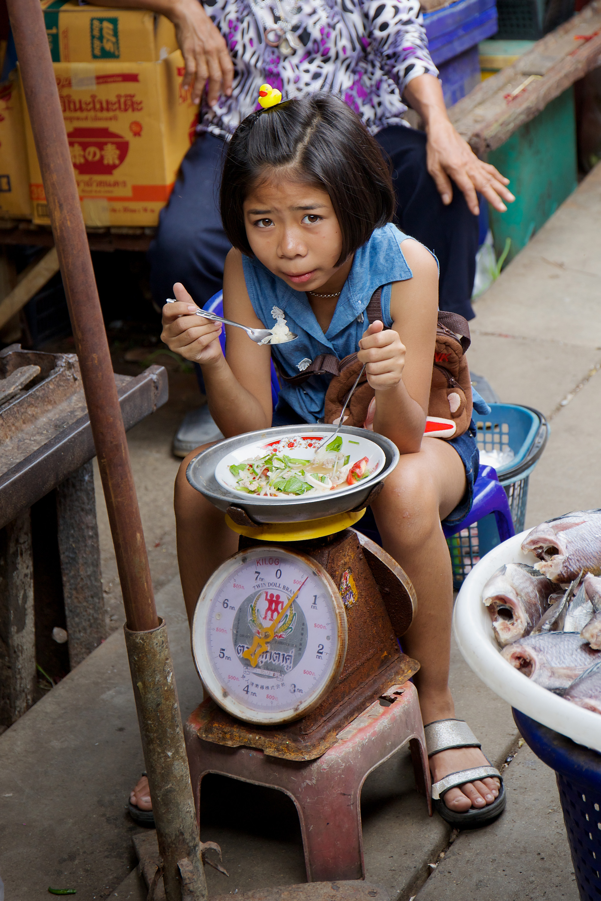 Here’s one candidate: a girl eating a healthy salad from the top of an ancient set of scales. There’s a large bowl of fish next to her, so I assume her mother sells fish in the market where I took the shot, which is actually a few miles outside Bangkok.