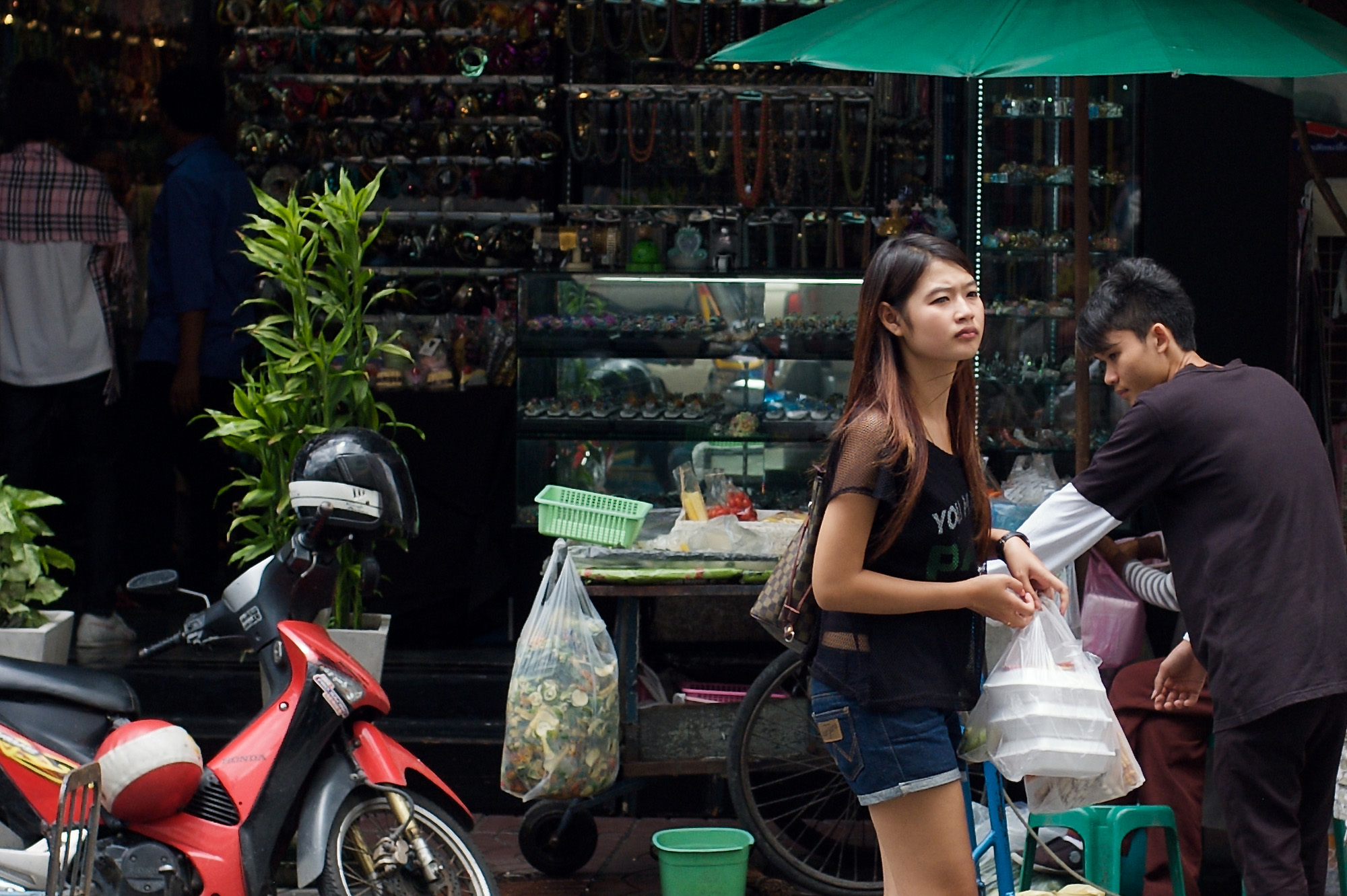 On one occasion I was riding in a “tuk-tuk” (windowless three-wheel taxi) when the driver made a perilous U-turn to avoid queuing in traffic. Before he gathered speed again I took this shot (below) of two women staring blankly into space. The late evening light was poor, but I’d had the forethought to switch to ISO 800 and succeeded in getting a sharp image.