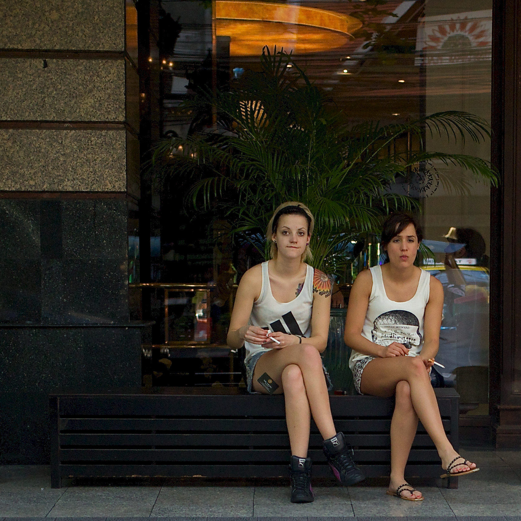 Is it a “fleeting image”? Yes, as far as I’m concerned, because I know the circumstances under which it was taken. It couldn’t have been more fleeting! But I admit it looks almost posed, as if I’d asked the two women to light cigarettes at the same time, and to cross their legs in the same direction.