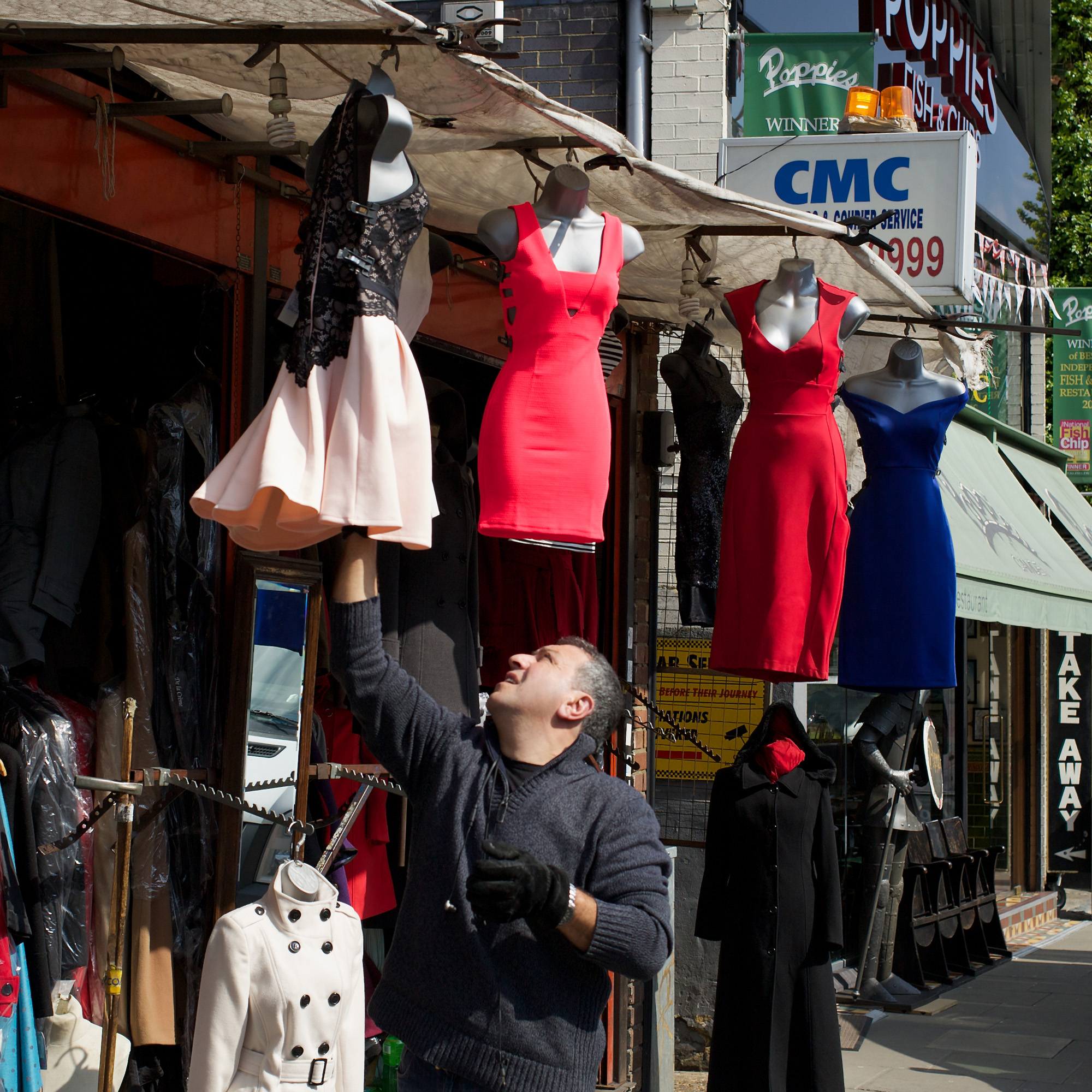 Here’s another shot from Camden, taken shortly afterwards. I like the way the storeman handles the dresses with thick gloves (which would have stood out better in a contrasting colour).