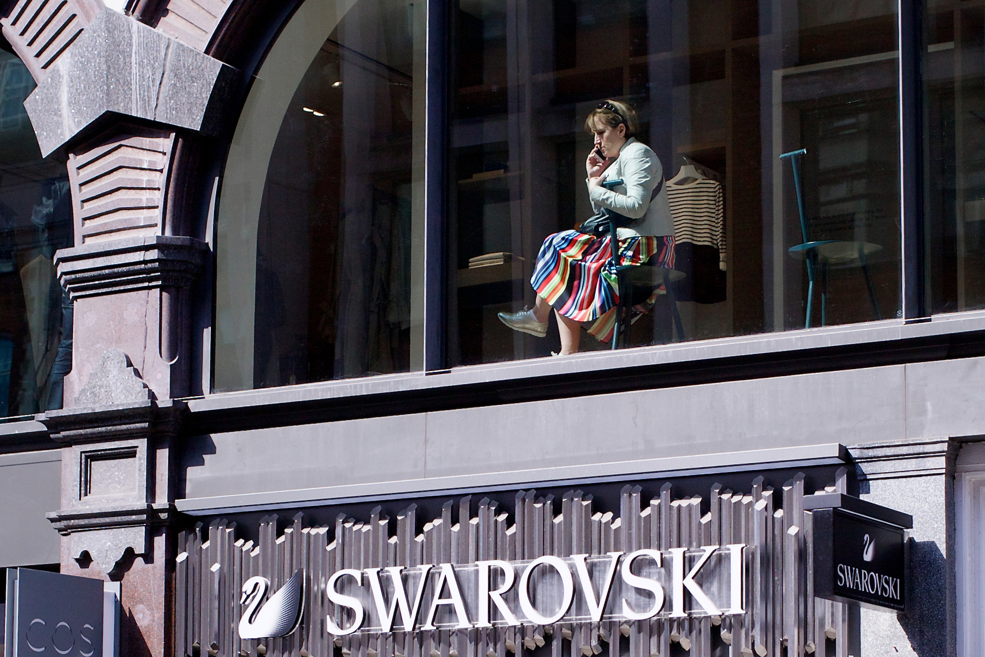 Sometimes a scene is readymade. Here, for example, is a woman in a multi-coloured dress, sitting in a huge window on a sunny day in central London above a costume jewellery store.