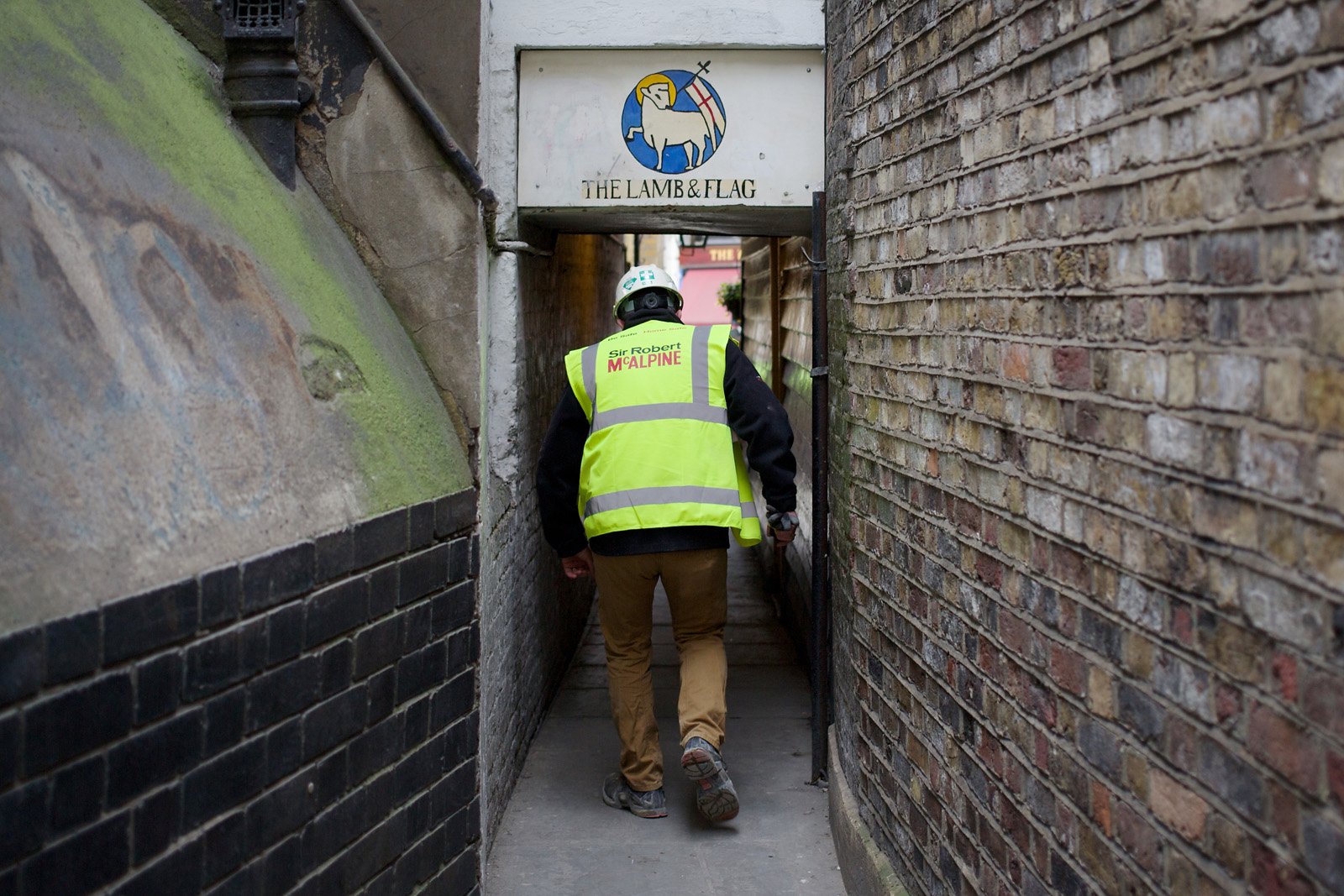 My featured image (above) shows how I solved the problem. I simply took a candid picture of a construction worker ducking his head to walk under a narrow and very ancient passageway. The contrast between the size of the figure and the narrowness of the passage says something about how the modern world is too big, too dynamic, too aggressive to be constrained by old buildings. It makes you wonder: will this man supervise the destruction of the “Lamb & Flag”? One hopes not, but you can never tell.