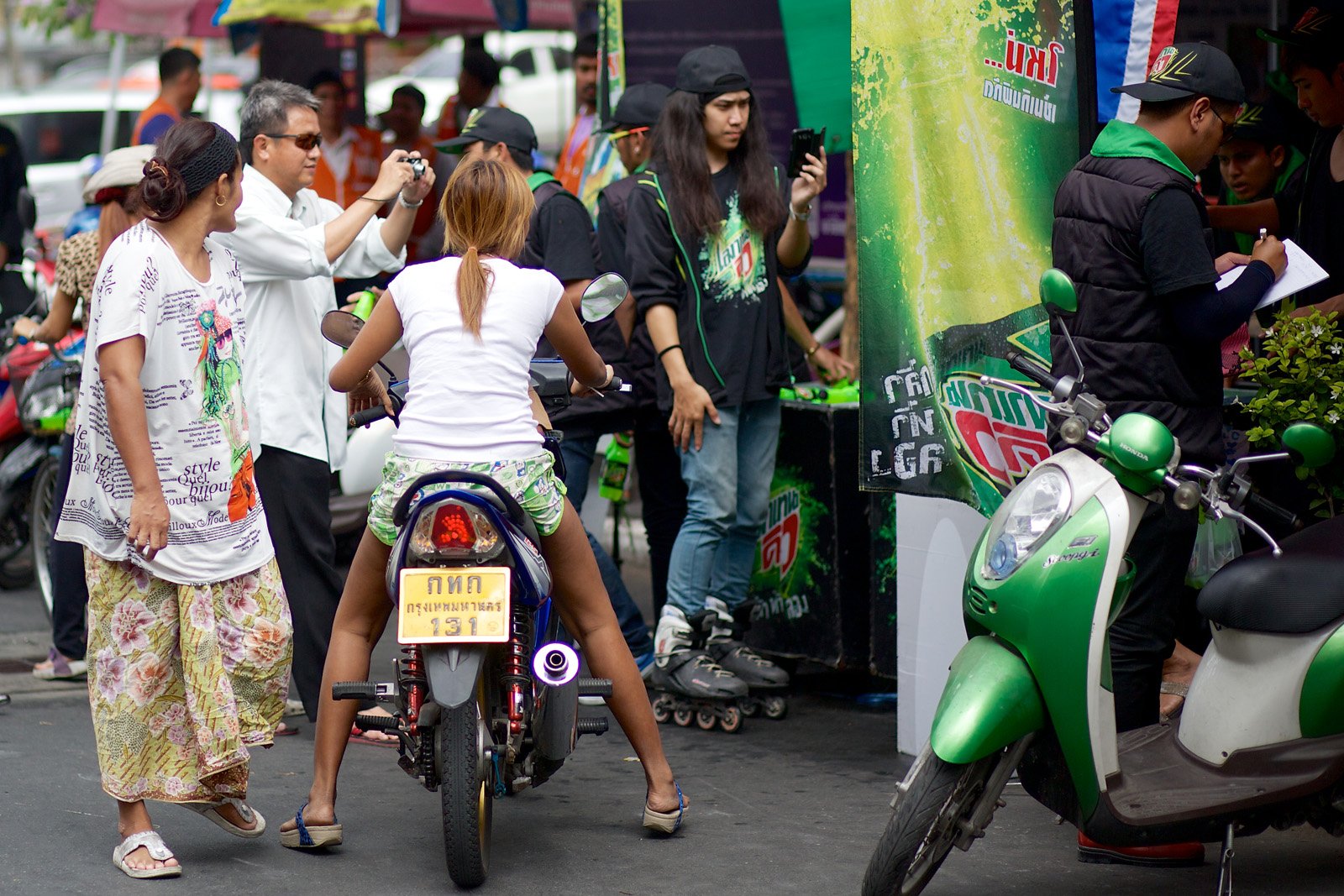 To the male eye, the girl’s brown legs make a natural focus of interest, but they also form a pyramid that leads the eye away from them (well, momentarily at least) to the guy taking a photo and the head of the woman with the garrulous tee-shirt who is watching him. If your eye strays back to the girl’s legs you’ll see the huge pair of roller skates being worn by the man with long hair who’s checking his phone. From him, it’s a short jump to the other side of the picture where another man is writing notes on a pad. His reversed baseball cap fills the top right of the frame; the green scooter fills the bottom right.