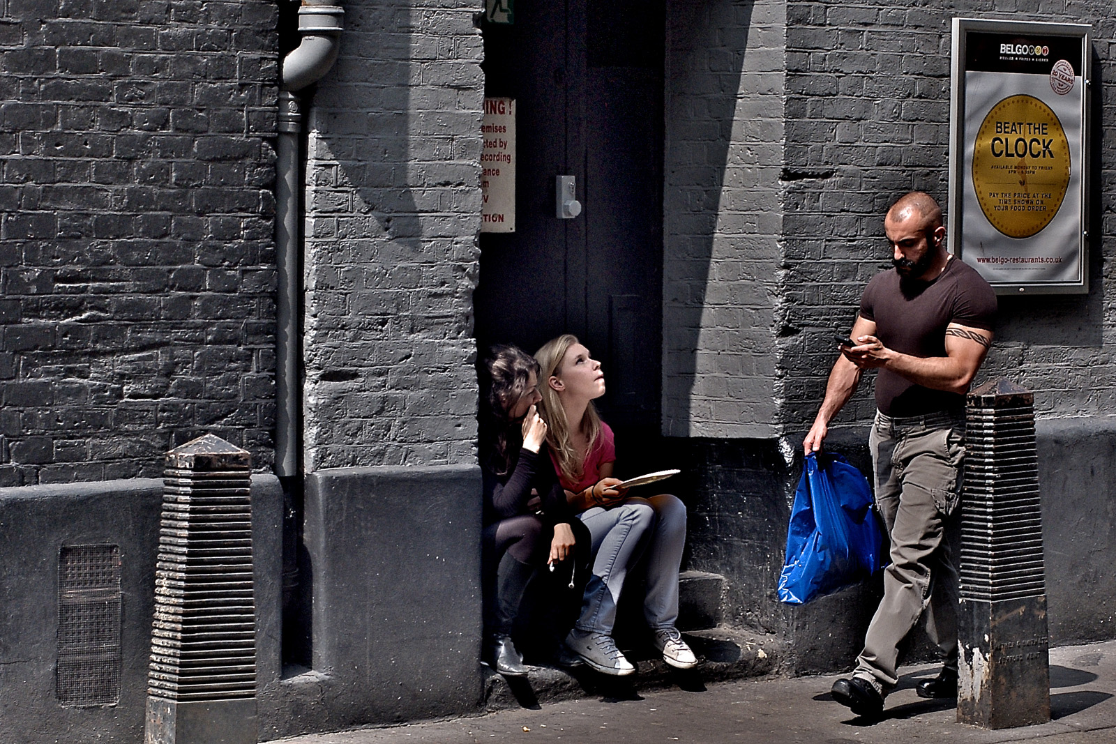 Alternatively (see the image below), I’ve been known to intrude on people eating an uncomfortable lunch somewhere behind the London International Film School, where I once worked. The backstreet location in Covent Garden lacks any feminine charm of its own and here its toughness is augmented by the presence of a tattooed and heavily muscled man who hurries along the grey street past the doorway with its half-concealed red warning sign. It couldn’t be grittier or more urban, could it? But hardcore? Not really.