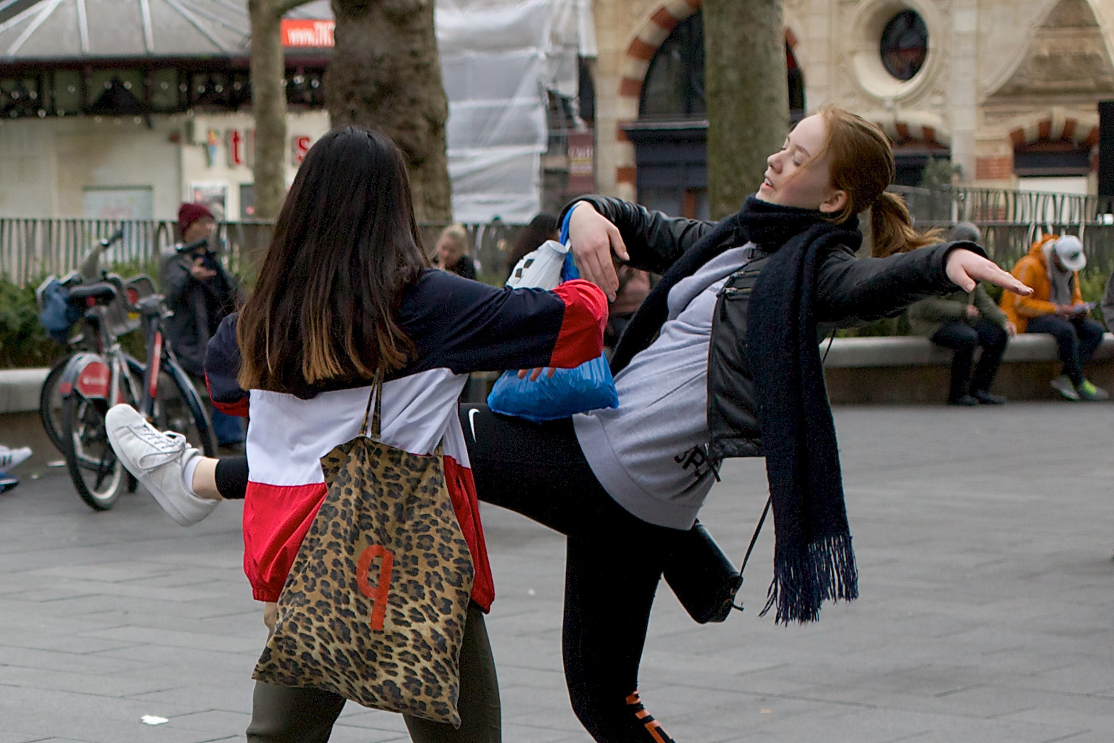 A photograph of organised dancing can never be a fully fledged street photo, no matter where you take it. For that, you need to find a spontaneous outbreak of dancing, which certainly happens now and again, although I’ve not yet found anyone who’s chosen to dance in front of an uncluttered background.